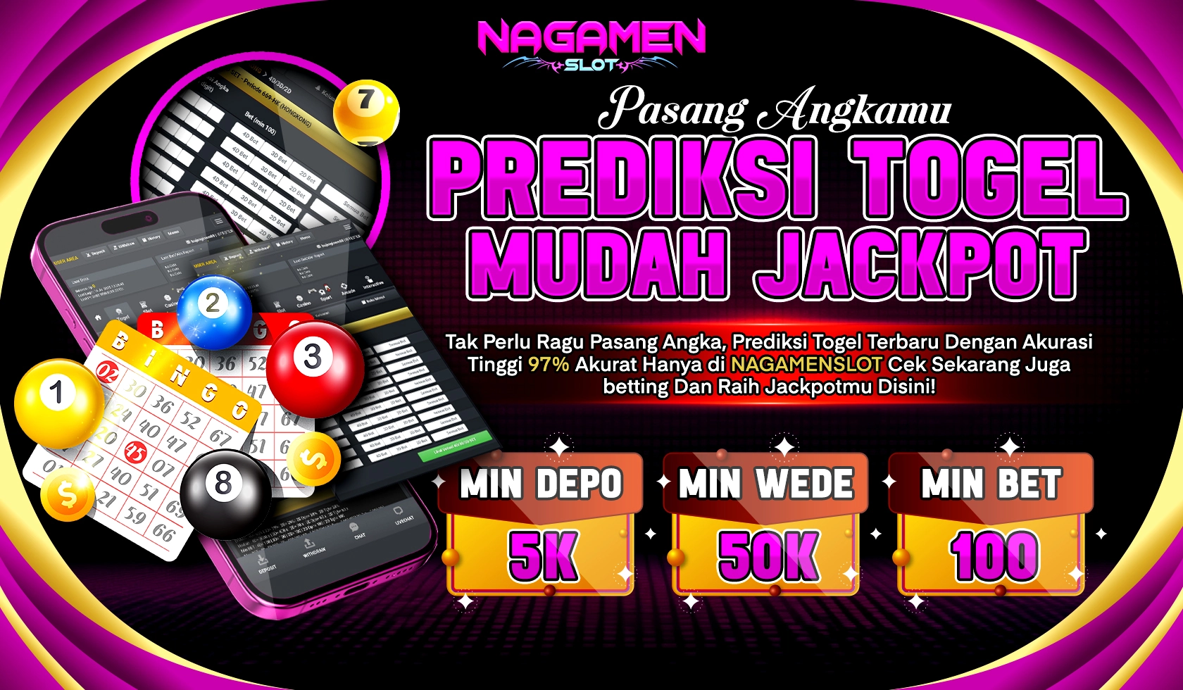 Bermain togel semakin seru di NAGAMENSLOT dengan dukungan 21 pasaran resmi dari negara-negara populer seperti Singapore, Hongkong, Sydney, dan lainnya. Tersedia taruhan dari 100 perak, dan Anda bisa menikmati semua jenis permainan mulai dari 2D, 3D, 4D, colok bebas hingga BBFS dengan sistem otomatis yang memudahkan. Hasil result diperbarui real-time tanpa delay.