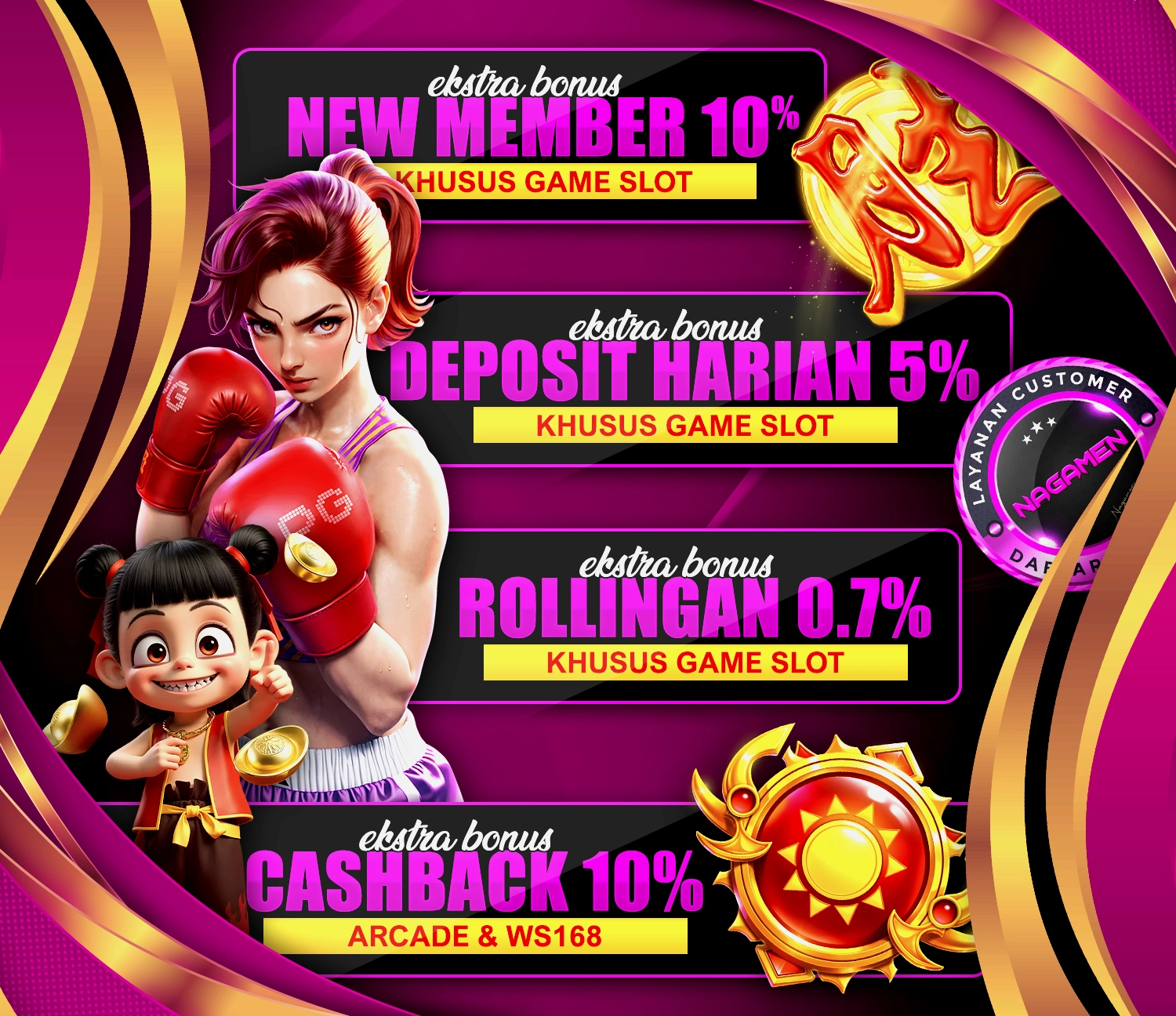 Untuk yang suka permainan santai, NAGAMENSLOT juga punya koleksi game arcade seperti puzzle, ketangkasan, dan tembak gelembung. Walaupun simpel, tetap ada bonus dan koin yang bisa dikonversi menjadi saldo asli.